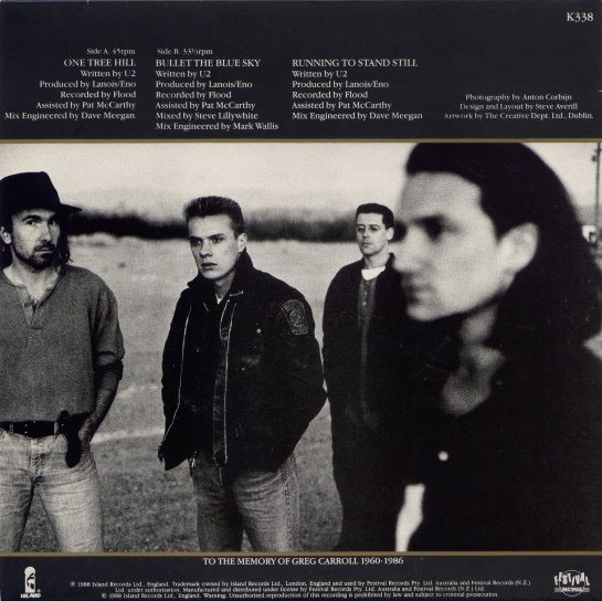One Tree Hill: Written by U2. Produced by Lanois / Eno. Recorded by Pat McCarthy / Flood. Mix Engineered by Dave Meegan. Bullet the Blue Sky: Written by U2. Produced by Lanois / Eno. Recorded by Flood. Assisted by Pat McCarthy. Mixed by Steve Lillywhite. Mix Engineered by Mark Wallis. Running to Stand Still: Written by U2. Produced by Lanois / Eno. Recorded by Flood. Assisted by Pat McCarthy. Mix Engineered by Dave Meegan. Photography by Anton Corbijn. Design and Layout by Steve Averill. Artwork by The Creative Dept. Ltd., Dublin. To The Memory of Greg Carroll 1960-1986.