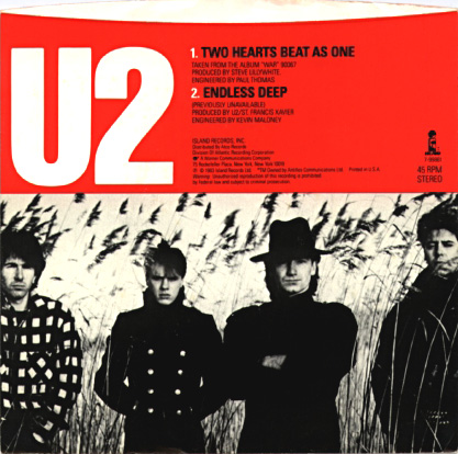 This single is U2's second from their 1983 album War. Bono wrote "Two Hearts Beat As One" on his honeymoon. The song ranked as the fifth most popular single in New Zealand's Rip It Up poll that year. It also was number 18 on the U.K. charts. The double 7" version of this single contains the 7" mix of "Two Hearts Beat As One," the B-side "Endless Deep," and two remixes, "New Year's Day (US Remix)" and "Two Hearts Beat As One (US Remix)," both previously available on the French New Year's Day. The double 7" version was only released in the U.K. in this form. Until the band's techno era, there were probably more versions of "Two Hearts" released than any other song. The Two Hearts Beat As One single has never been released on CD.